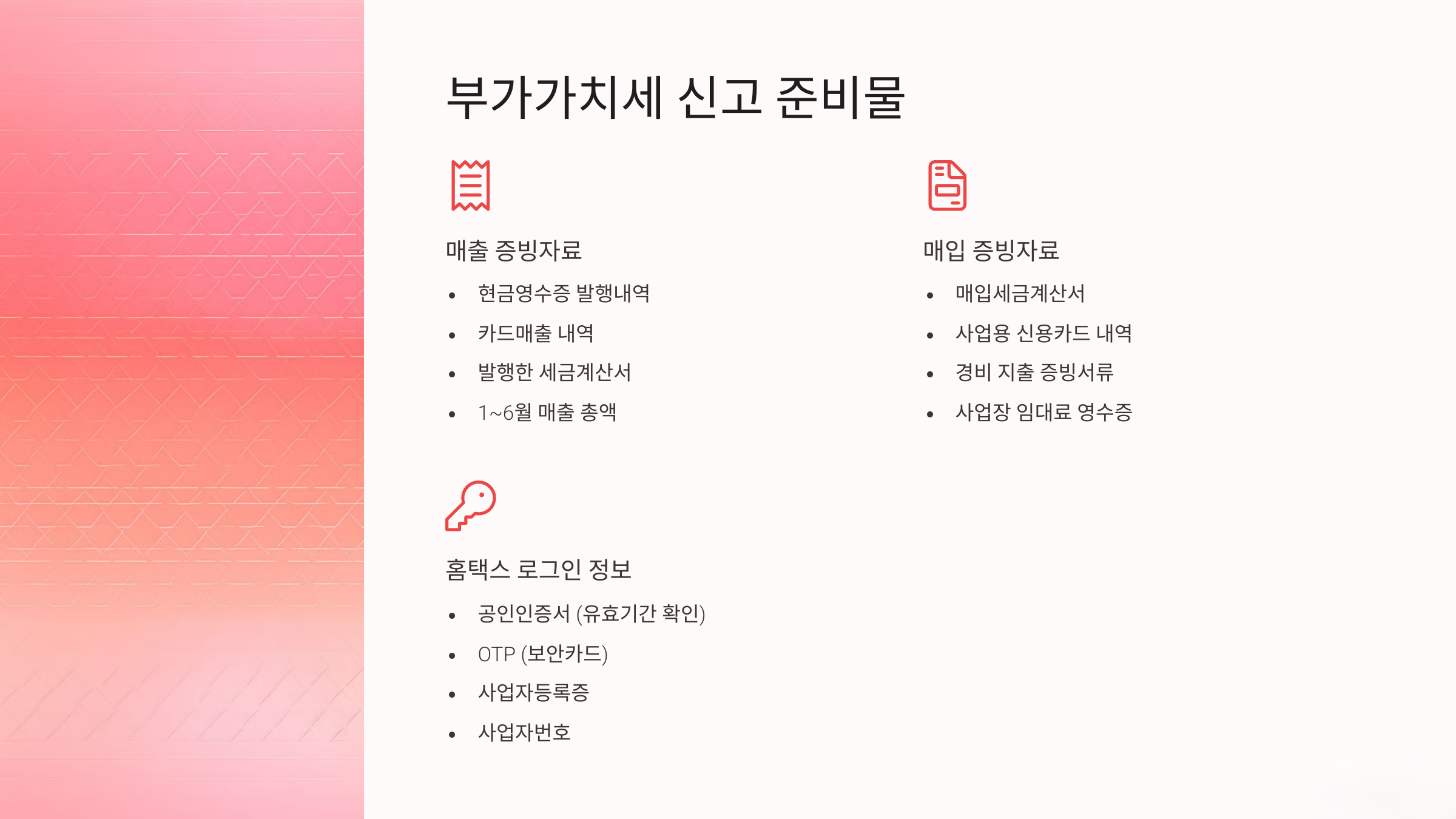 특히 1기 확정신고(1~6월 매출)라 규모도 크고, 가산세 폭탄도 생길 수 있으니 꼼꼼히 준비해야 합니다.