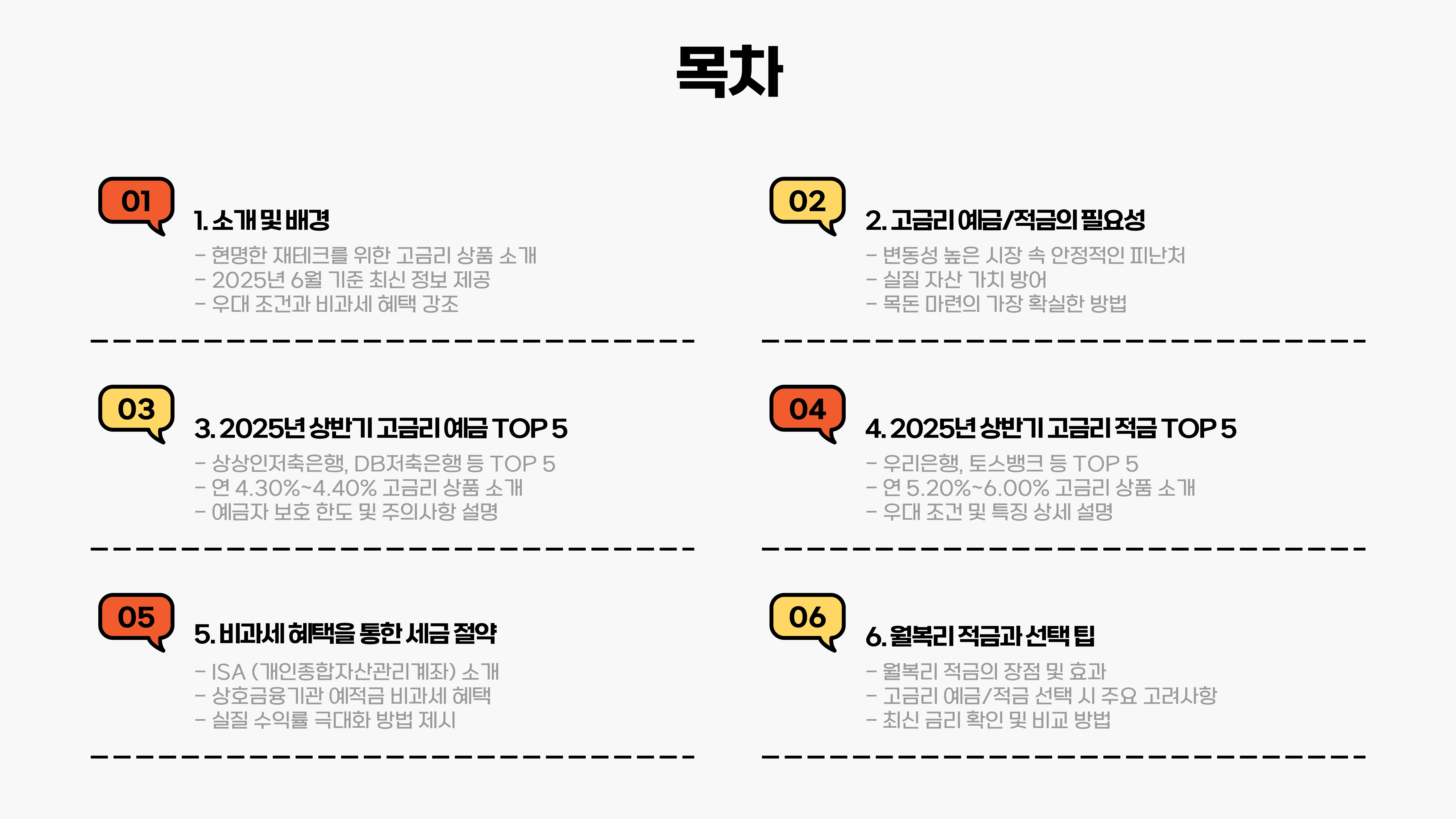 2025년 상반기에도 여전히 현명한 선택을 통해 더 높은 이자를 받을 수 있는 고금리 예금과 적금 상품들이 존재합니다. 오늘 소개해 드린 정보들을 바탕으로 여러분의 소중한 자산을 안전하게 불려나가시길 바랍니다.