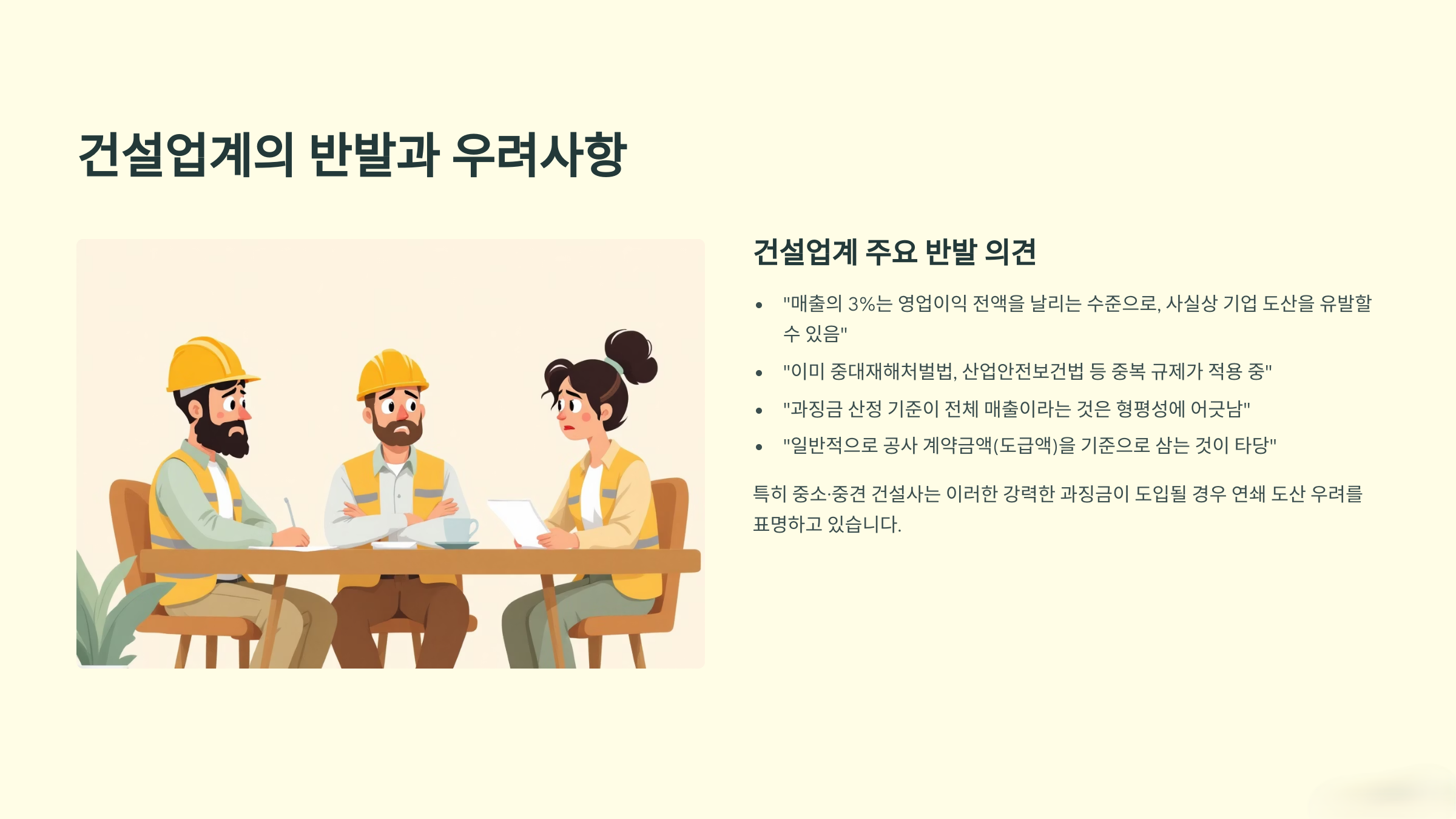 사망사고 발생 시, 건설사 매출액의 최대 3% 과징금 또는 최대 1년의 영업정지가 가능하도록 한